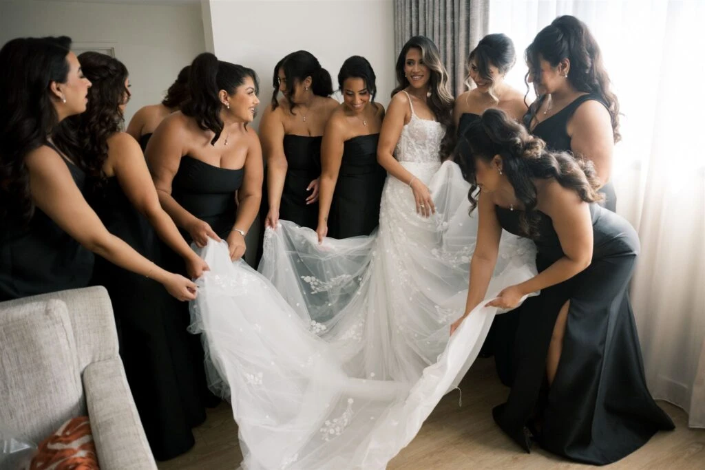 I wanted my wedding to be timeless, something I will always look back on every detail and still love. With that, I decided not to go for any specific colors that may be “trendy” or any colors I was currently loving. I stuck to black and white for everything with small touches of gold. My bridesmaids wore black, and it was so beautiful and timeless.Â