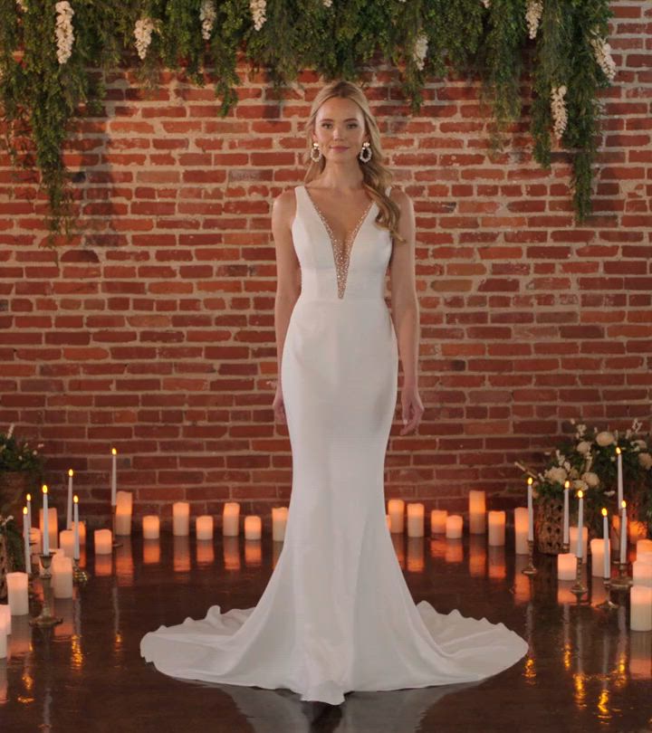 Dieses elegante und stilvolle enganliegende Brautkleid kombiniert moderne Laufstegmode mit zeitloser Eleganz. Von den Schulterträgern taucht das Modell D3763 in einen tiefen V-Ausschnitt ein, der mit dezenten, perlenverzierten Akzenten versehen ist, bevor er auf die Taille trifft. Schimmernde Perlendetails betonen auch den V-Ausschnitt am Rücken mit einer Reihe stoffbezogener Knöpfe, die bis zum Saum der schwungvollen Schleppe reichen. Dieses minimalistische, perfekt geschneiderte Kleid lässt die Braut an ihrem großen Tag erstrahlen. Dieses Hochzeitskleid ist auch in Übergrößen erhältlich.