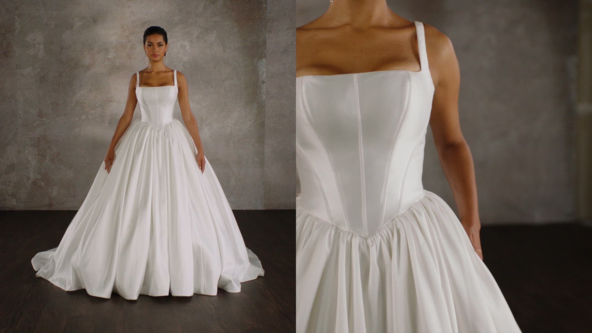 Königliche Eleganz trifft auf modernen Charme in diesem groĂartigen Prinzessinnen-Ball-Brautkleid aus luxuriösem Mikado-Stoff. Das Modell D4145 verfĂŒgt ĂŒber klassische, eckige TrĂ€ger, die in einen schicken Karree-Ausschnitt ĂŒbergehen und ein enganliegendes Oberteil mit architektonischen NĂ€hten umrahmen, die die schrĂ€ge Baskentaille ergĂ€nzen. Ab der Taille schwingt ein voller und geraffter Mikado-Rock nach auĂen und bildet eine majestĂ€tische Ball-Brautkleid-Silhouette. Dieses bezaubernde Hochzeitskleid mit Taschen wurde fĂŒr die moderne Prinzessinen-Braut entworfen, die an ihrem besonderen Tag praktische Eleganz sucht.