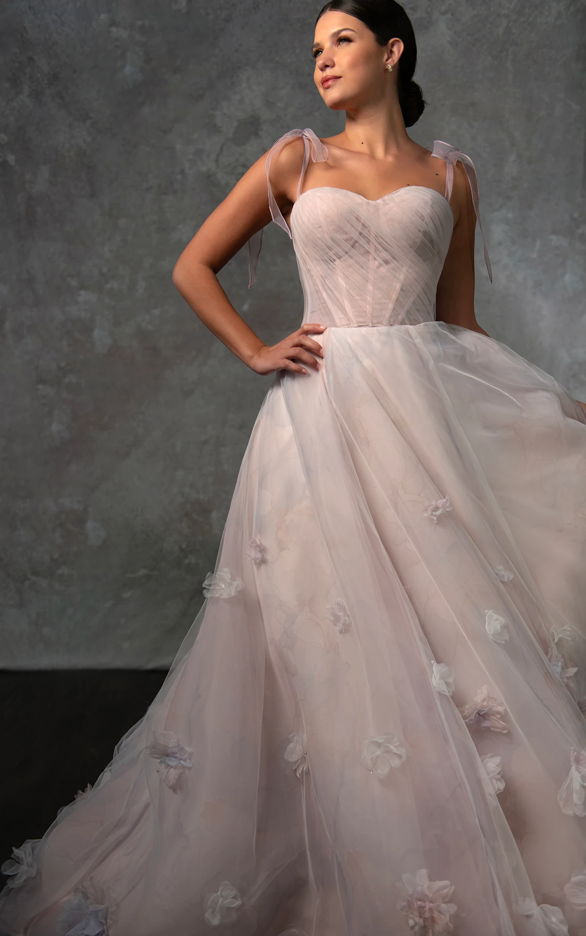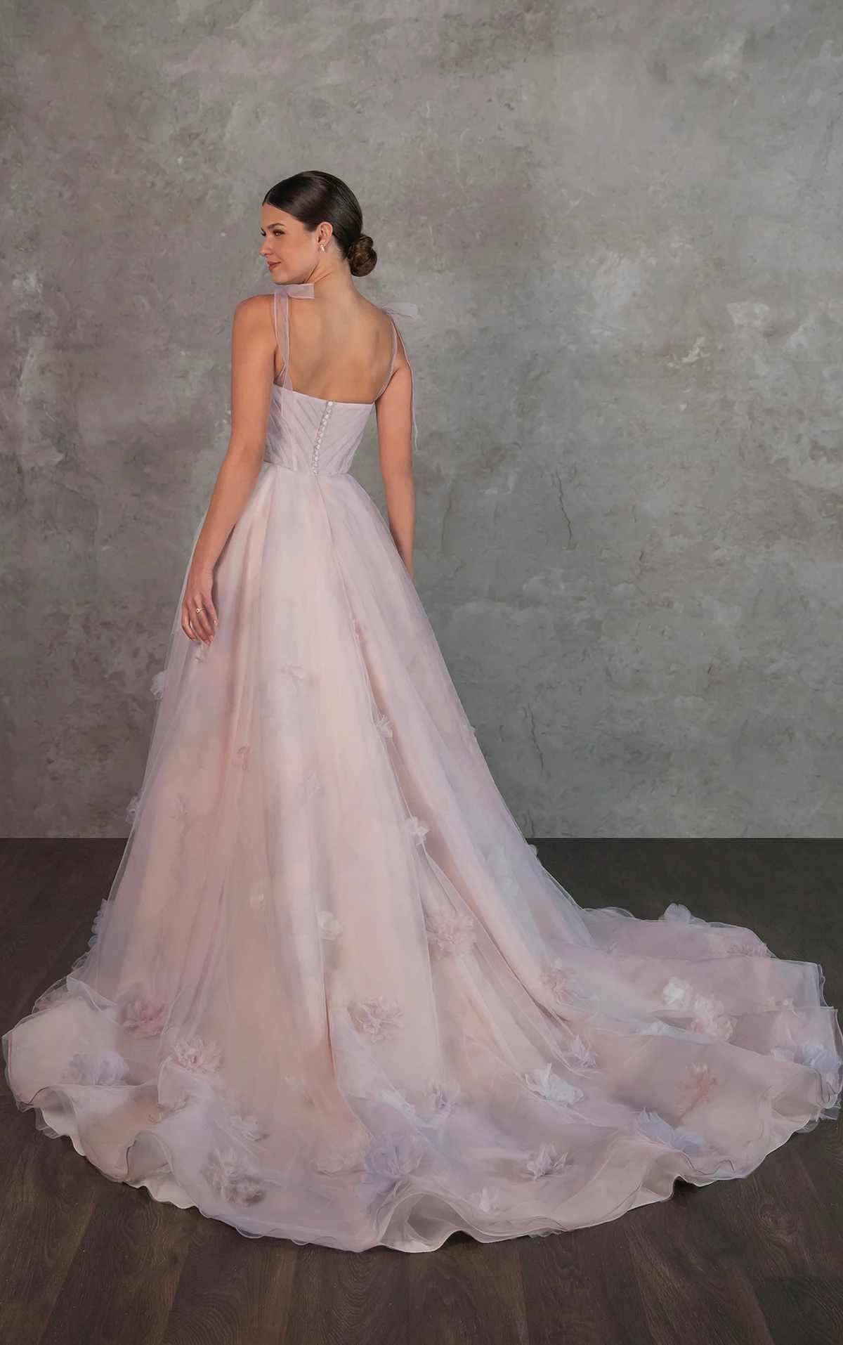 Dieses farbige Brautkleid aus Organza ist eine traumhafte Verschmelzung von himmlischer Romantik und moderner Kunst und wurde für die moderne Braut entworfen, die einen Hauch von Farbe sucht. Das Modell D4320 in Orchid verzaubert mit zarten Tüllbändern, die zu einem sanft gerafften, herzförmigen Ausschnitt führen und ein romantisches und feminines Oberteil bilden. Ab der Taille fließen Schichten aus rosafarbenem Tüll in eine leichte A-Linien-Silhouette, die mit fließenden 3D-Organza-Blumen verziert ist, für einen verspielten, naturinspirierten Effekt. Für Bräute, die klassische Eleganz bevorzugen, ist dieses bezaubernde Design auch in Elfenbein erhältlich. Eine atemberaubende Wahl für alle, die sich eine frische Interpretation eines wunderschönen Brautlooks wünschen.