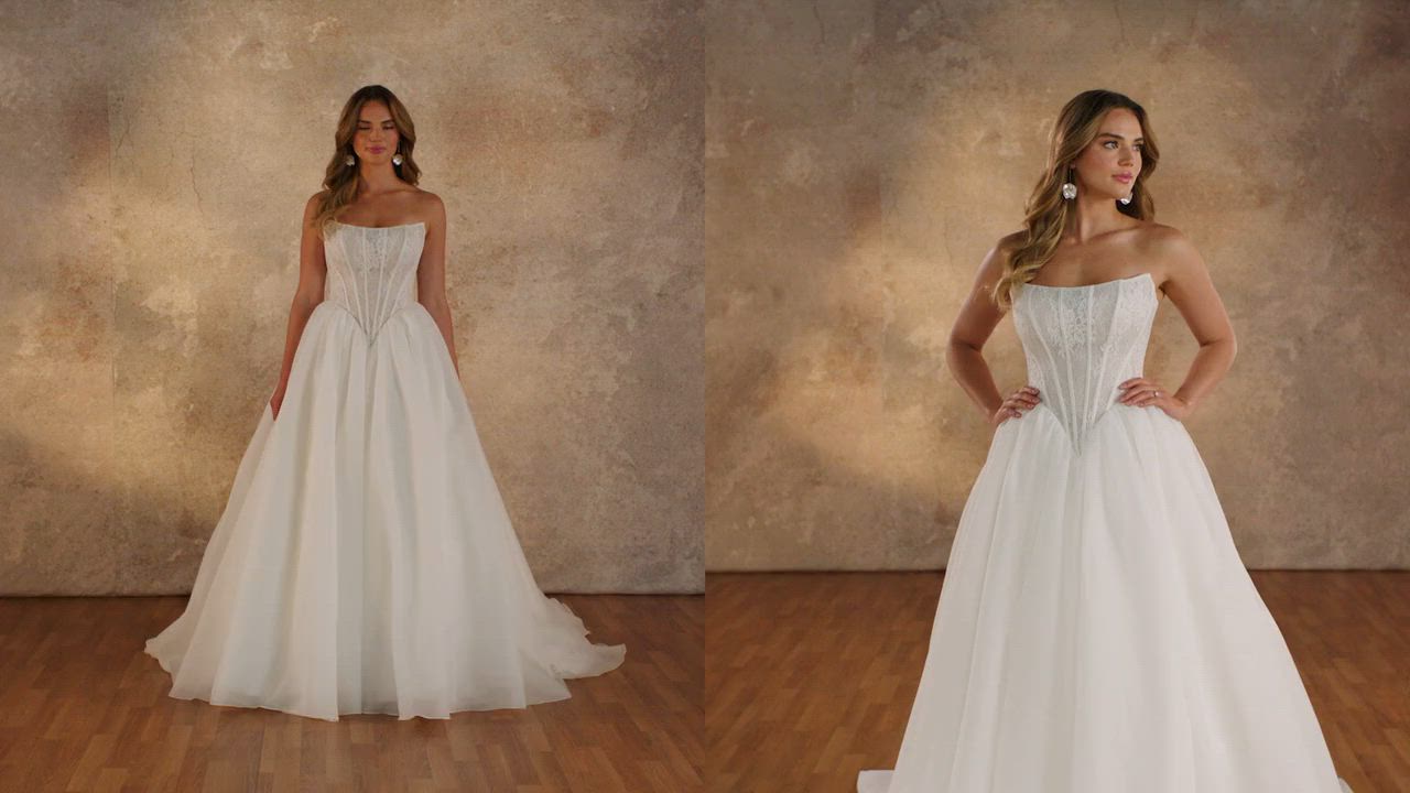 Das Modell D4458 vereint modernes Design mit ausdrucksstarken Details. Das trägerlose Oberteil aus transparenter Spitze bietet zarte Einblicke und einen dezenten Schimmer, während die extreme Baskentaille die Figur mit gewagten, strukturierten Linien in Szene setzt. Gefertigt aus edlem Empress-Organza, verleiht das geraffte Hüftvolumen dem Rock dramatische Fülle und schwungvolle Bewegung in die Ballkleid-Silhouette. Dieses Kleid ist für die Braut, die sich ein unvergessliches Statement mit raffinierter, modischer Eleganz wünscht. Auch in Übergrößen erhältlich.
