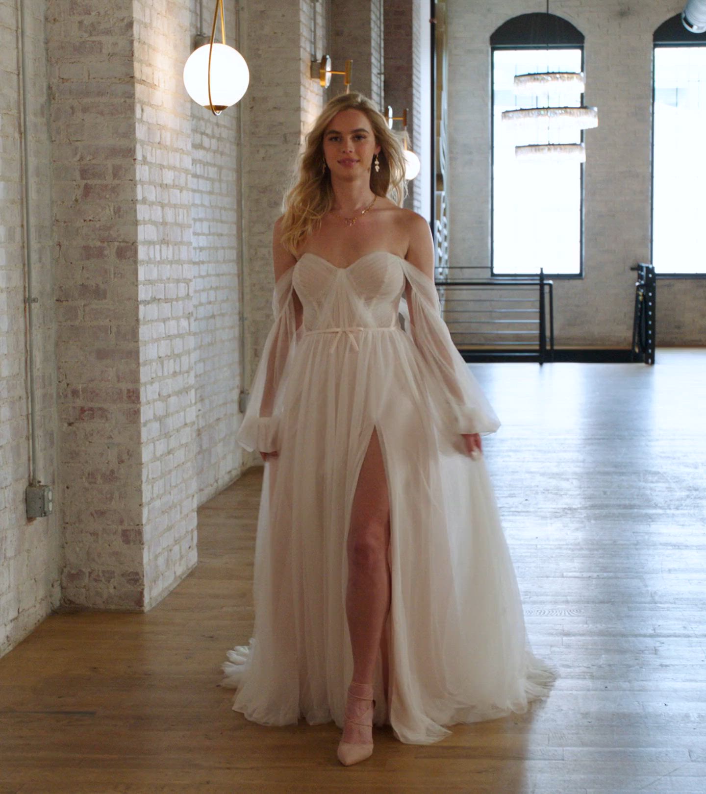 Dieses bezaubernde Boho-Hochzeitskleid verbindet moderne Eleganz mit Boho-Details für die freiheitsliebende Braut. Das Modell 7802 hat abnehmbare lange Blouson-Ärmel, die am transparenten Oberteil befestigt werden und den romantischen herzförmigen Ausschnitt betonen. Der sanft drapierte Rock aus französischem Tüll vervollständigt diesen Brautlook und bildet eine klassische, zarte A-Linien-Silhouette. Moderne Designerdetails wie der abnehmbare Gürtel und der hohe Beinschlitz verleihen dieser raffinierten Version des modernen Boho-Hochzeitskleides einen modernen Touch.