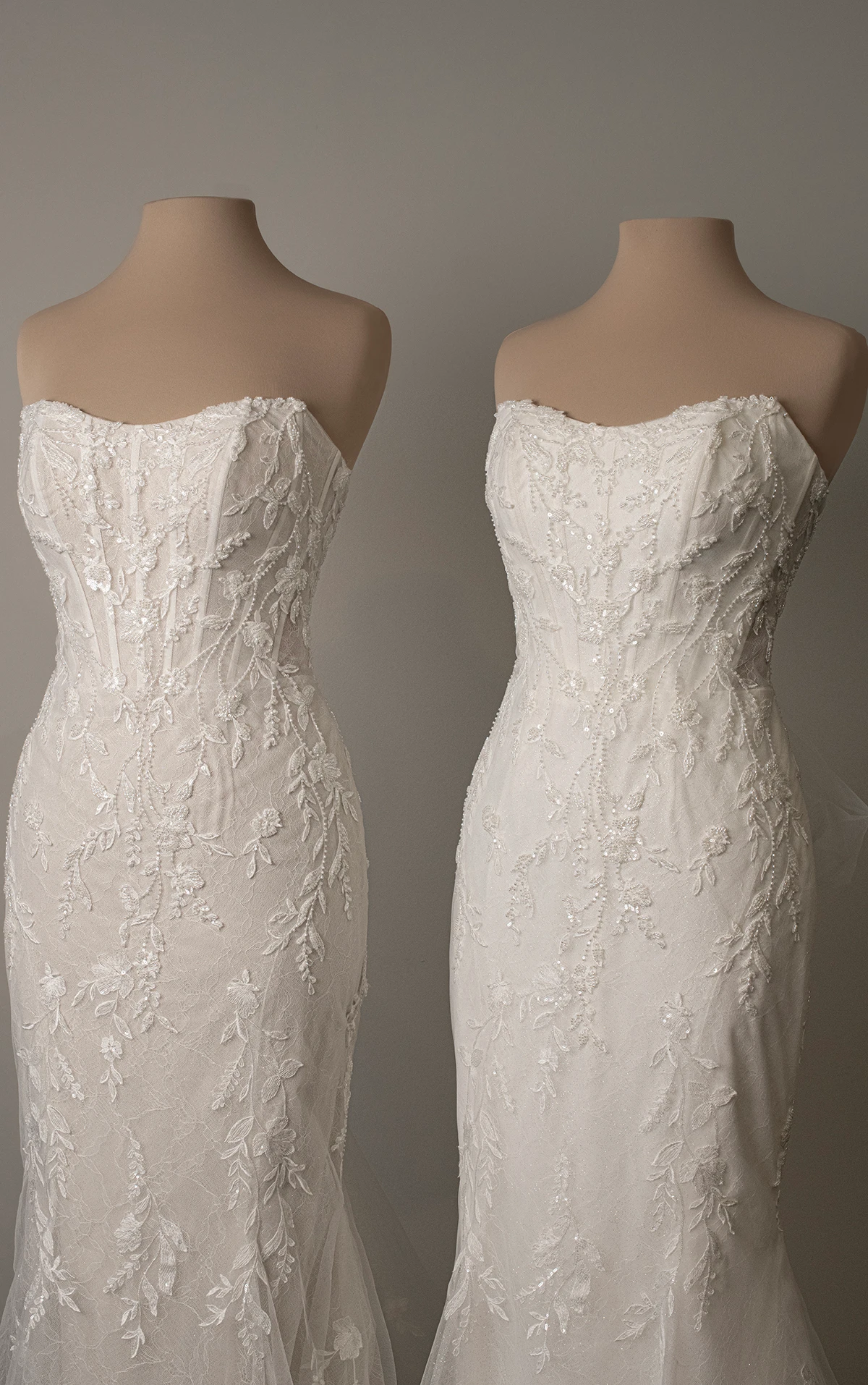 Betritt eine Welt voller Romantik mit der himmlischen Schönheit des Modells SY8160, einer traumhaften Mischung aus zartem Tüll und romantischer Chantilly-Spitze. Abnehmbare schulterfreie Blouson-Ärmel fließen mühelos und verleihen dem korsettartigen Oberteil mit freiliegenden Korsettstäbchen und schimmernden Spitzenakzenten eine zarte, verspielte Note. Im Rücken vervollständigt eine Reihe stoffbezogener Knöpfe das transparente Korsettoberteil und trifft auf einen schmalen, taillierten Rock, der anmutig drapiert ist. Mit seiner luftigen Eleganz und seinem bezaubernden Design ist das Modell SY8160 eine atemberaubende Wahl für die Braut, die sich sowohl verspielt als auch mühelos raffiniert fühlen möchte.