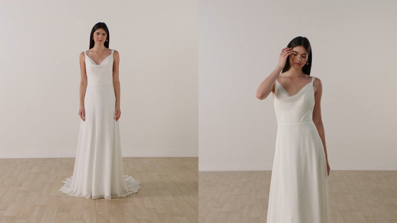 Effortless and ethereal, Style SY8255 is a chiffon A-line wedding dress. This gown is the picture of modern minimalism with a touch of drama. From delicate straps, the softly scooped cowl neckline drapes with understated elegance, leading to a sleek bodice that flatters the figure. In the back, an ultra-low V-back detail makes a bold and unforgettable statement, while the lightweight chiffon skirt grows gracefully into the sweeping train. With its clean lines and airy movement, this gown is the ultimate choice for the bride who craves simple sophistication with a sultry twist.