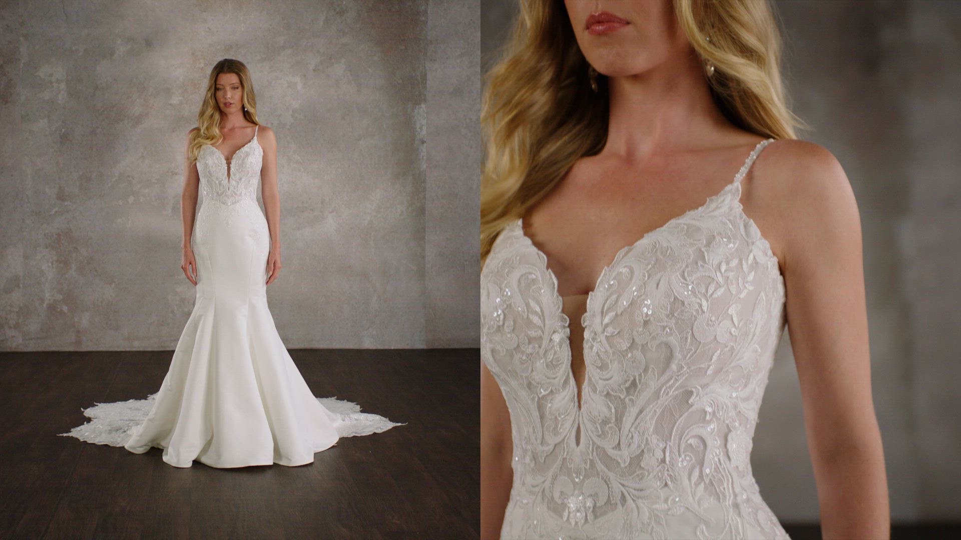 Sexy and sophisticated, this showstopping bridal design features a stunning fit-and-flare silhouette in luxurious satin and lace. Style D4226 features delicate spaghetti straps that meet a soft V-neckline, plunging into a sheer lacy bodice adorned with graphic lace appliques. Alluring side cutouts shape the figure, highlighting the natural hourglass silhouette and outlining the waist as it transitions into the luxe satin fit-and-flare skirt that flares into a dramatic trumpet silhouette, creating a pedestal effect as the bride walks down the aisle. A long shaped train with lace cutouts provides a romantic finish to this sexy lace wedding gown, made for the bride who wants a mix of timeless romance and modern design.