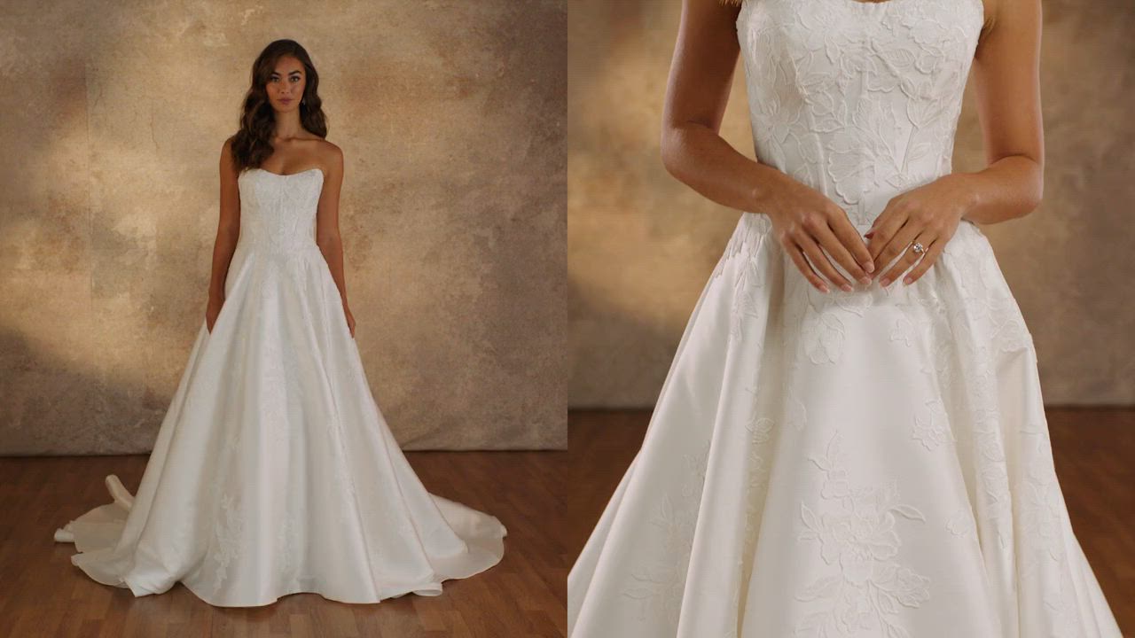 Embodying modern royalty, Style D4407 is a strapless A-line gown, featuring a boned corset bodice adorned with large floral lace appliqués that add refined texture. Crafted from smooth Mikado and rich lace, the sweetheart neckline beautifully frames the décolletage, while the subtle drop waist flows seamlessly into a full Mikado skirt for a graceful A-line silhouette. This gown balances classic elegance with contemporary detail, designed for the bride who desires a statement look that is both timeless and fashion-forward. Also available in plus sizes.