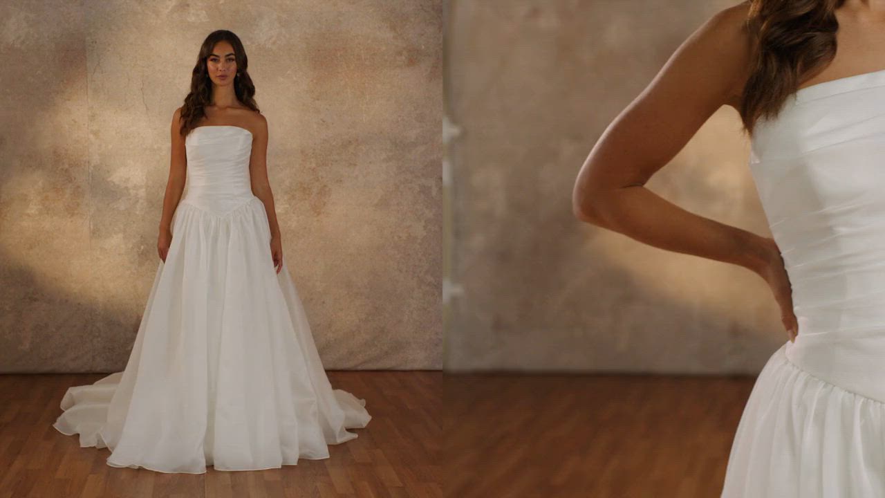 Classic chic meets ballet-inspired grace in Style D4454. This strapless A-line gown features a long, wrapped bodice that gently sculpts the torso, highlighted by ruched detailing for subtle texture. The low basque waistline accentuates the silhouette while leading to a gathered hip and flowing luxe organza skirt that moves with effortless elegance. The straight-across neckline adds clean simplicity to this refined design, making it an ideal choice for the bride who appreciates timeless style with delicate poise. Also available in plus sizes.