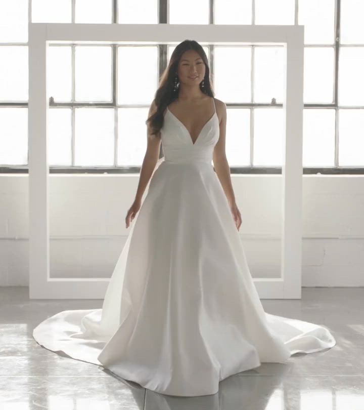 Style 1560 features sleek and thin spaghetti straps with a flattering V-neckline that tucks into a wide pleated waistband and elongates the figure in this chic, yet simple and clean A-line silhouette. In the back, a low squared back detail is accented with a large detachable bow for a modern and tasteful fashion statement in this overall minimalist gown. The sleek A-line skirt glows as the lustrous silk zibeline radiates pure luxury. Following the fabric-covered buttons down the back, a long luxe train completes the look for a stunning couture wedding dress that's available in plus sizes.