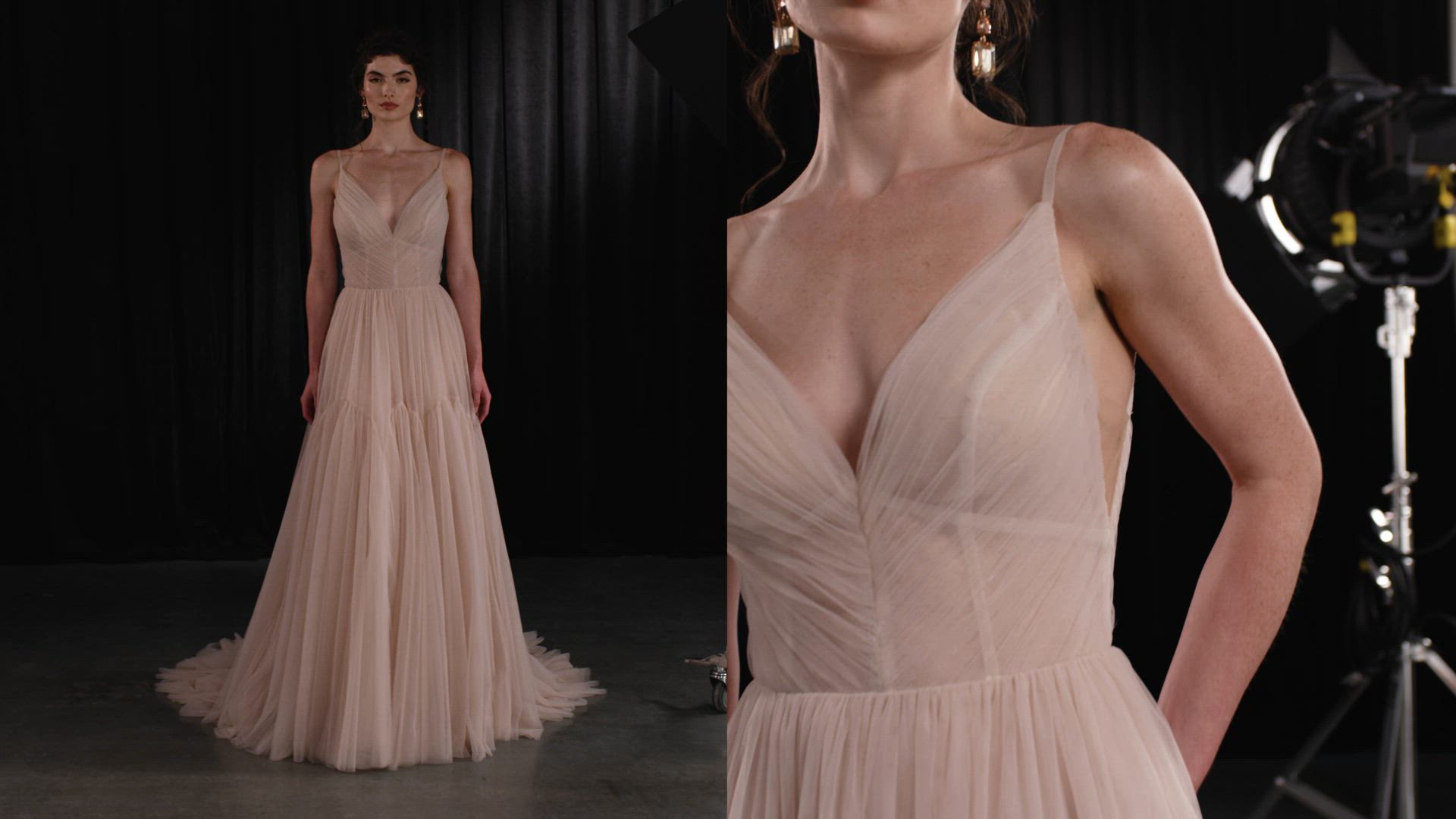Embodying ethereal romance with a modern twist, this blush pink wedding dress was made for the contemporary bride who wants a touch of color on that special day. Style 1871 in Canyon Rose pink features barely-there tulle spaghetti straps that attach to a chic V-neckline, introducing a beautifully ruched tulle bodice that comes in lined or unlined options. Complementary V-shaped side cutouts and a low V-back detail with fabric-covered buttons add a touch of timeless romance. From the waist, the soft A-line silhouette unfolds in gathered layers of soft pink tulle, gracefully flowing and gaining volume toward the hem. This pink tulle wedding dress offers brides a dreamy blend of romance and sophistication. For those preferring a more classic look, this gorgeous gown is also available in ivory and also in an unexpected blue/grey color.