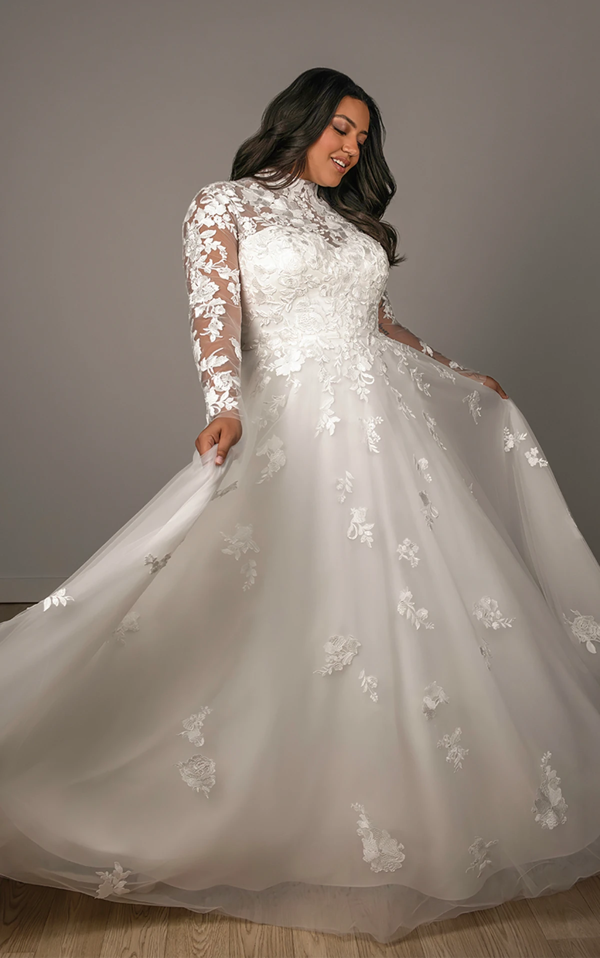 A timeless vision of bridal beauty with a modern twist, this breathtaking ballgown radiates romance. Intricate mixed floral lace creates a one-of-a-kind design, shaping a high neckline and sheer bodice that seamlessly blend classic elegance with contemporary allure. Cascading lace trails down the voluminous skirt, crafted from layers of tulle and organza for a soft yet full effect. A delicate keyhole back, framed by floating lace elements completes the look.